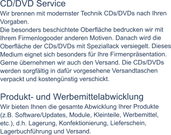 CD/DVD Service Wir brennen mit modernster Technik CDs/DVDs nach Ihren Vorgaben. Die besonders beschichtete Oberfläche bedrucken wir mit Ihrem Firmenlogooder anderen Motiven. Danach wird die Oberfläche der CDs/DVDs mit Speziallack versiegelt. Dieses Medium eignet sich besonders für Ihre Firmenpräsentation. Gerne übernehmen wir auch den Versand. Die CDs/DVDs werden sorgfältig in dafür vorgesehene Versandtaschen verpackt und kostengünstig verschickt.  Produkt- und Werbemittelabwicklung Wir bieten Ihnen die gesamte Abwicklung Ihrer Produkte (z.B. Software/Updates, Module, Kleinteile, Werbemittel, etc.), d.h. Lagerung, Konfektionierung, Lieferschein, Lagerbuchführung und Versand.